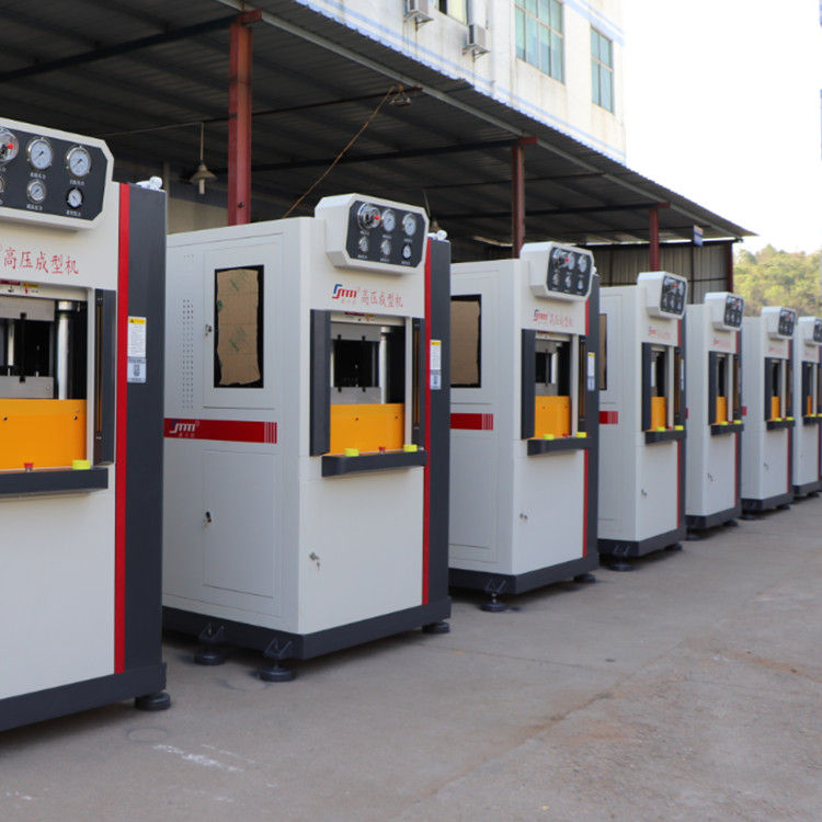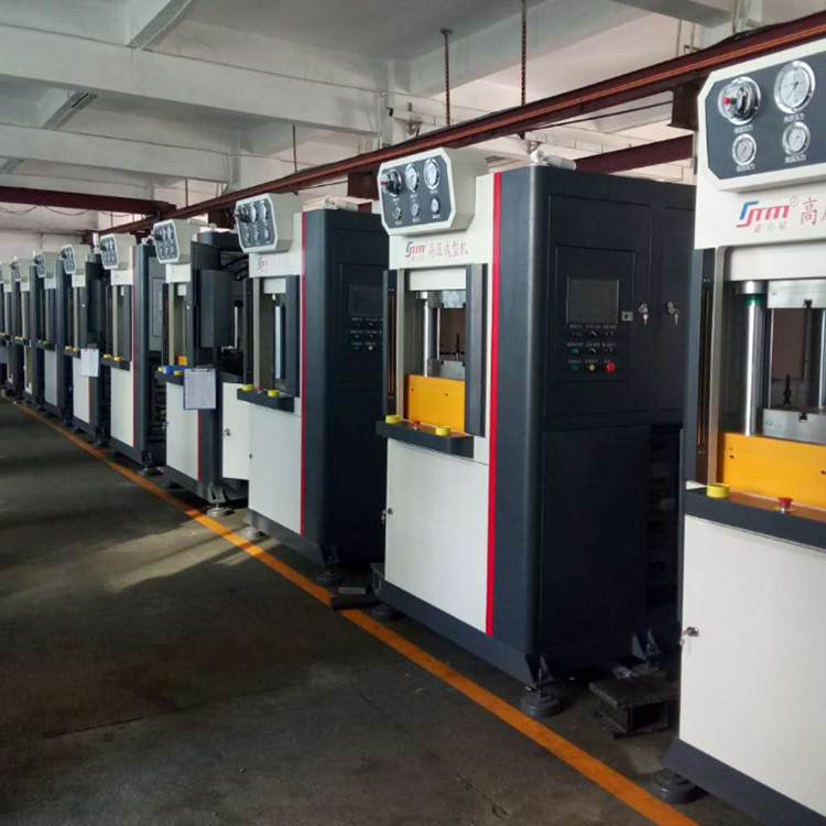 工作原理:沒有上模具,只有下模具,利用氣體的高壓將加溫軟化的片材,直接壓在下模具上,完成成型的部件。將膜材加熱到軟化點后合模,上模腔中高壓空氣通過分段高壓從上往下壓,下模腔進行抽真空,從而使得膜材與模具完美接合在一起。